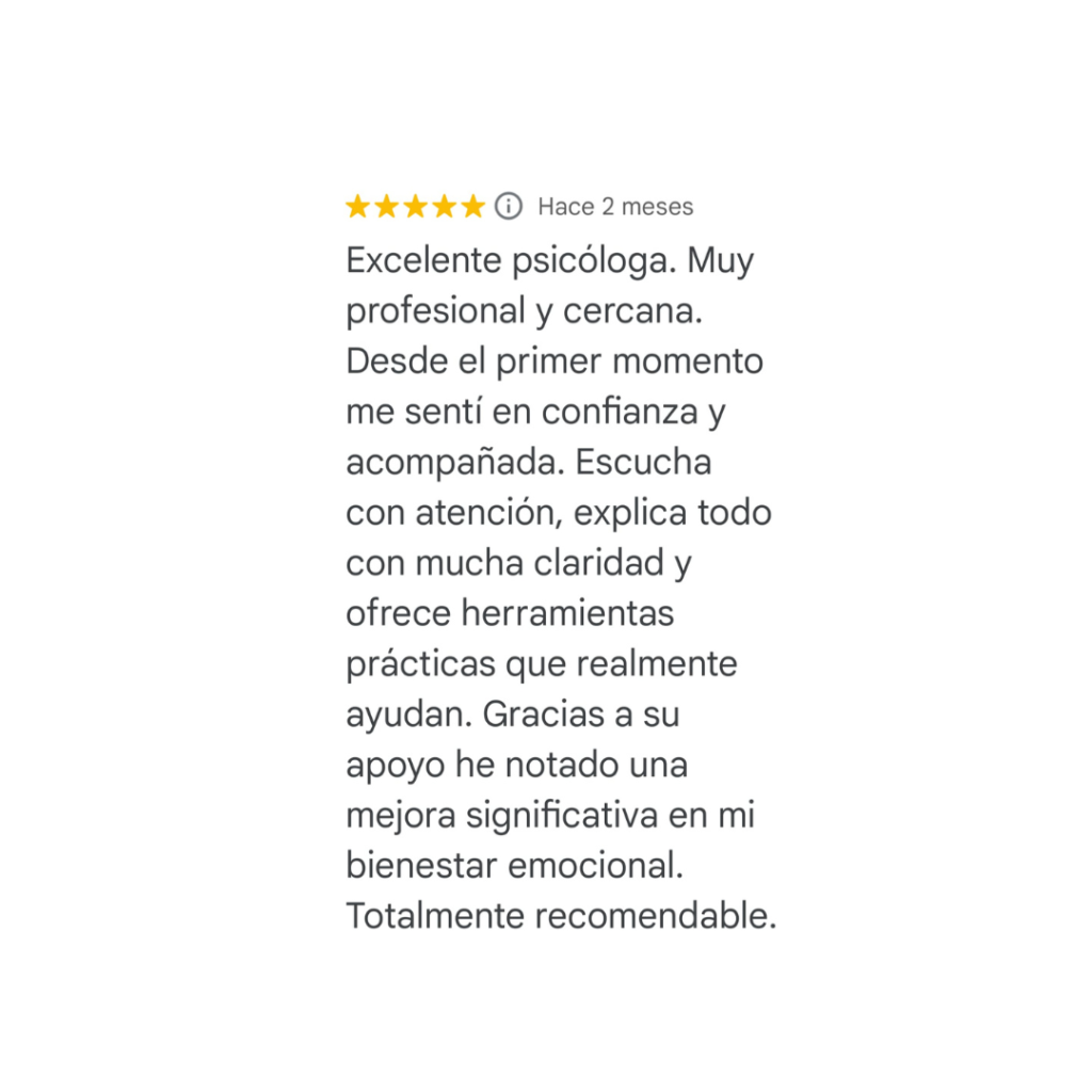 Desde mi formación y experiencia, mi objetivo es construir contigo una relación terapéutica basada en la confianza, el respeto y la seguridad. Porque lo más importante es que te sientas a gusto con tu psicóloga y que este sea un espacio donde puedas ser tú.